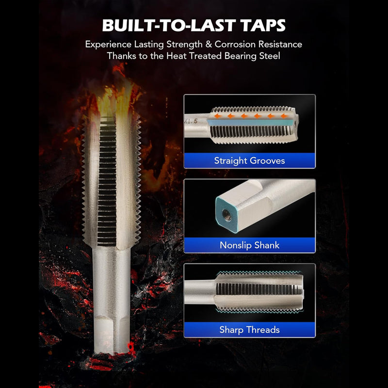 HIGH-SPEED STEEL TAPS - Made from HSS4241 high-speed steel, the taps are exceptionally hard and wear-resistant. This allows for clean, precise rethreading of the drain hole, ensuring a long-lasting and reliable repair.